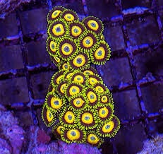 This species is photosynthetic but will benefit from feedings of phytoplankton. The Scrambled Egg Zoas have blue/purple mouths ringed in a very curious orange color and finish off with purple skirts tipped in yellow/orange.